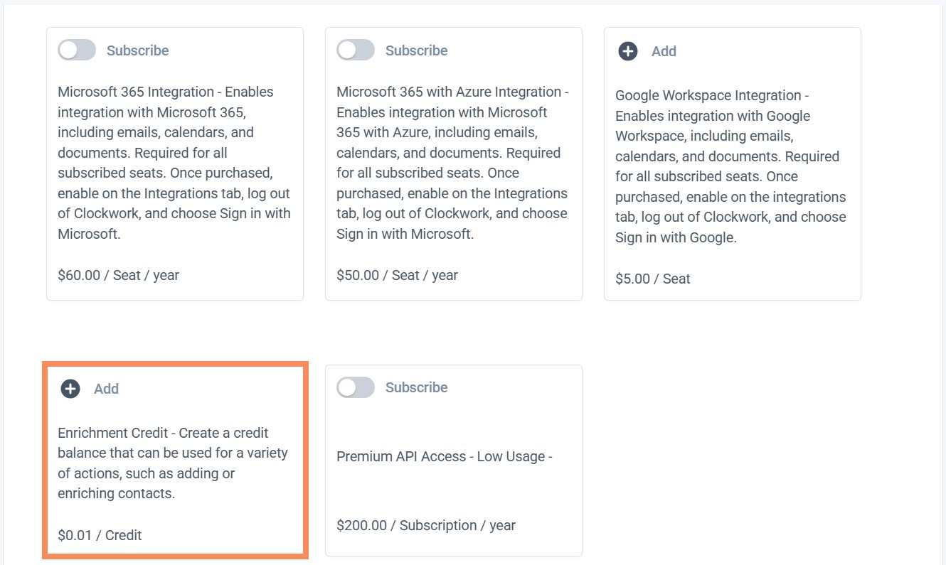 The Clockwork Person Enrichment Integration uses data providers to connect your Firm Database with LinkedIn Public Profiles. You can use this integration to update candidates records one by one or in bulk. Reports for the total records updated over any period of time are found in the Integrations tab, in the Integration Activity section. Users will be able to obtain credits to update records by purchasing a Subscription with a set of credits to update On Demand by your choosing.