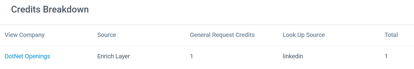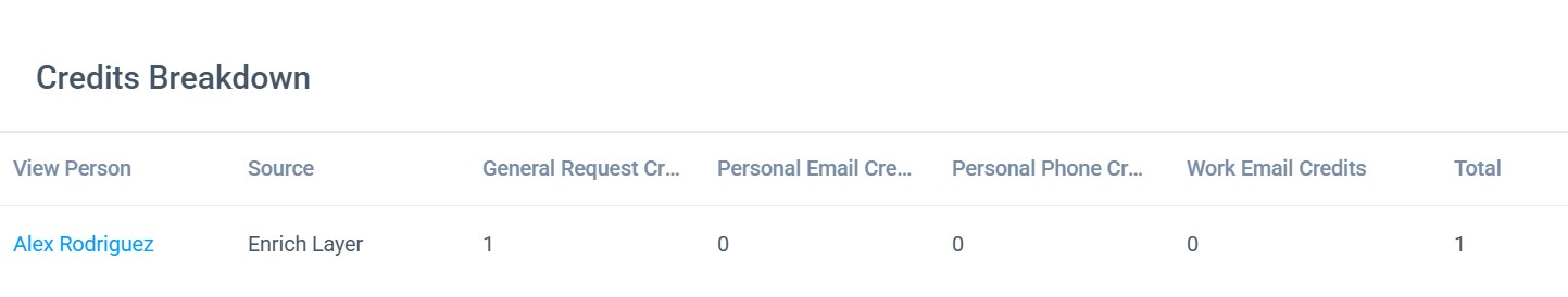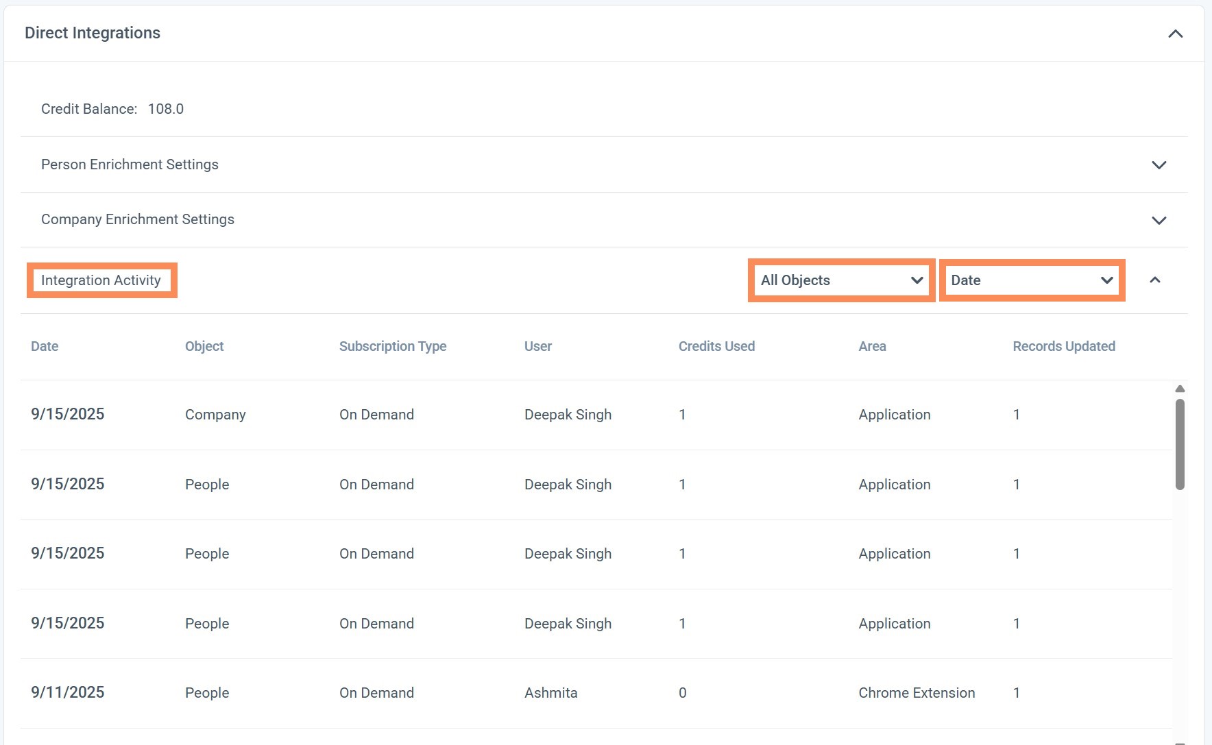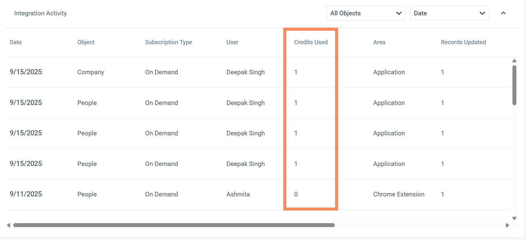 To look at the filtered view of which person or company record was updated and how many credits were used, click the number underneath the "Credits Used" column in the Integration Activity.
