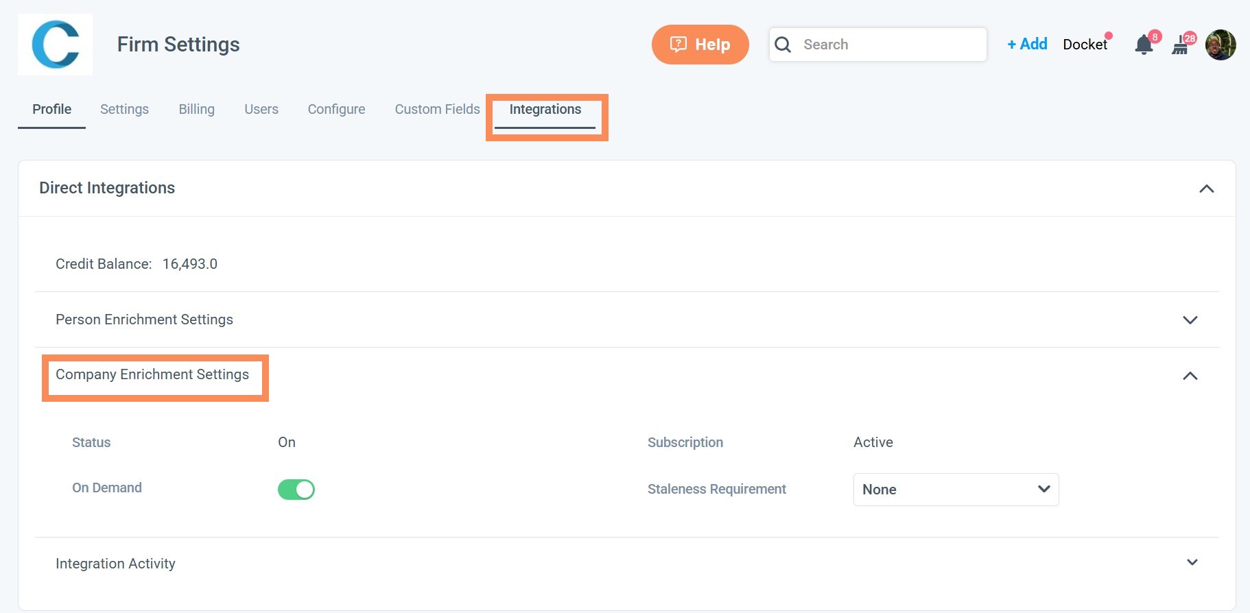 This article will detail how to turn on the Direct Integration found in the Integrations tab of your Firm Settings. This Company Enrichment Integration requires a credit to update one record inside of Clockwork. Users with a Partner or Admin role will be the only Users to access and manage the Integration Tab in Firm Settings.