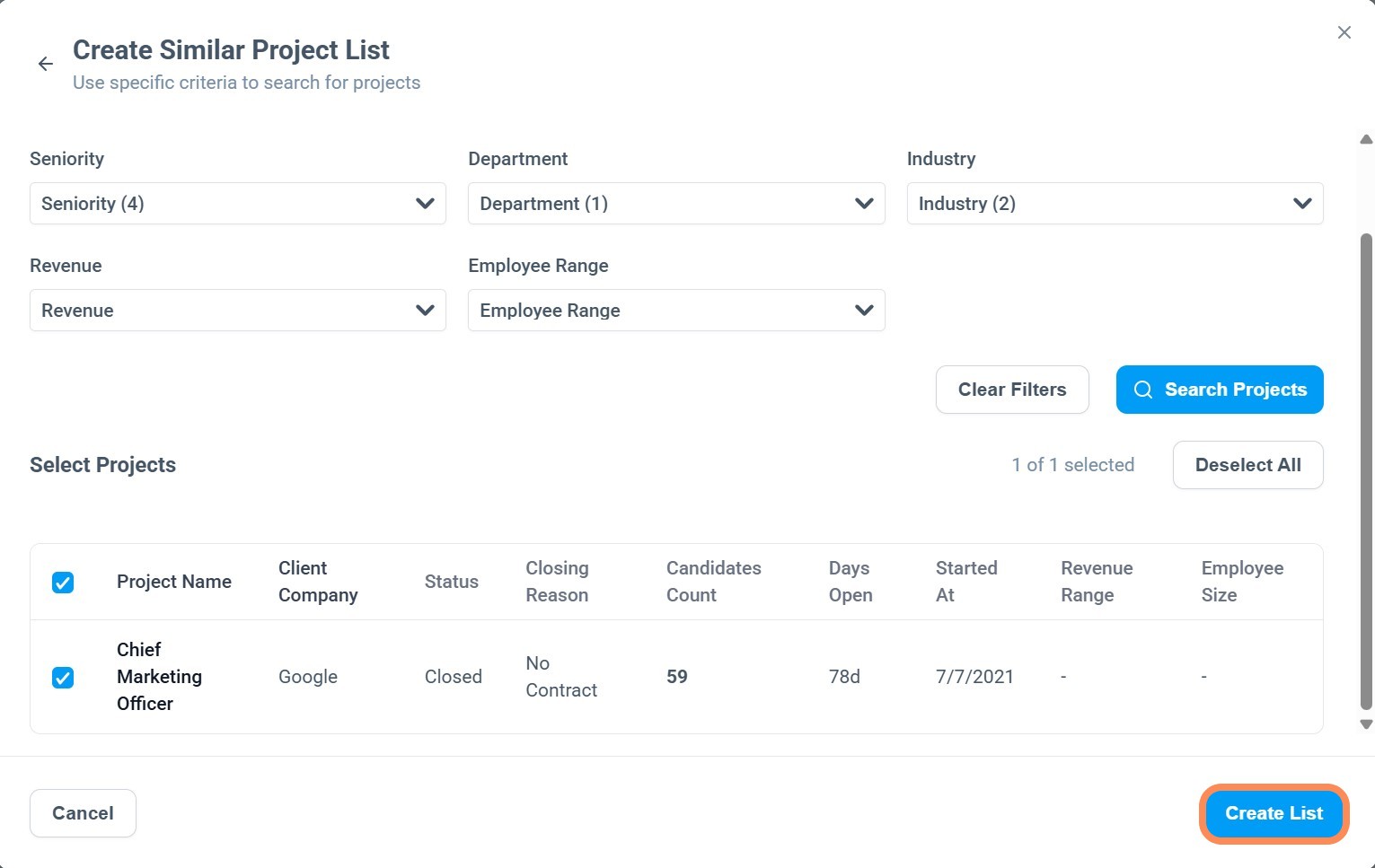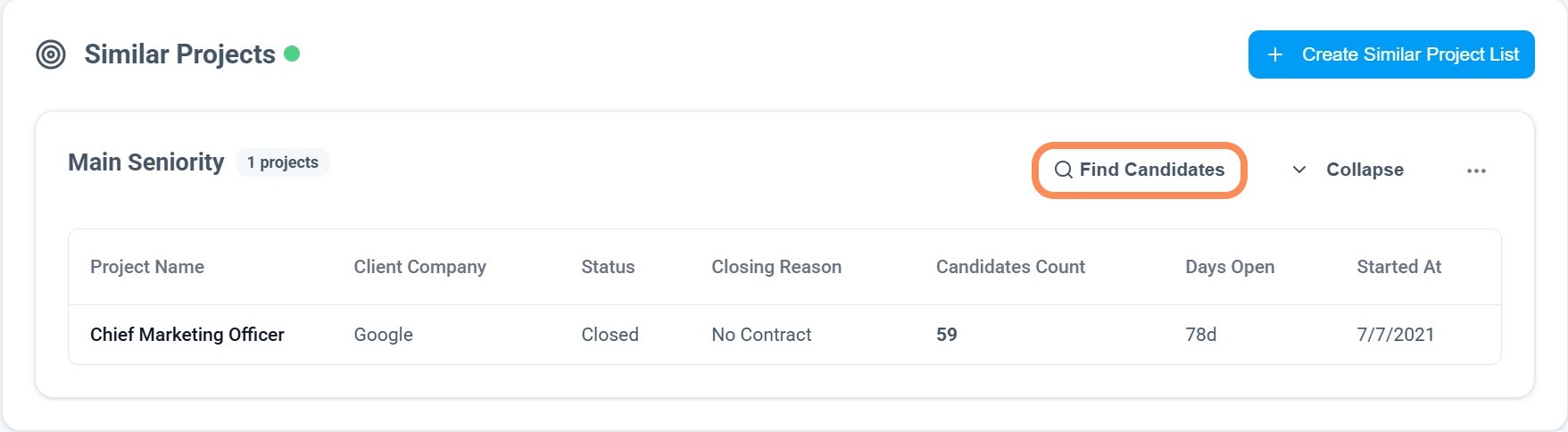 Now that you have your list of similar projects, clicking on the "Find Candidates" button will redirect you into People View with these projects and candidate a default statuses filtered.