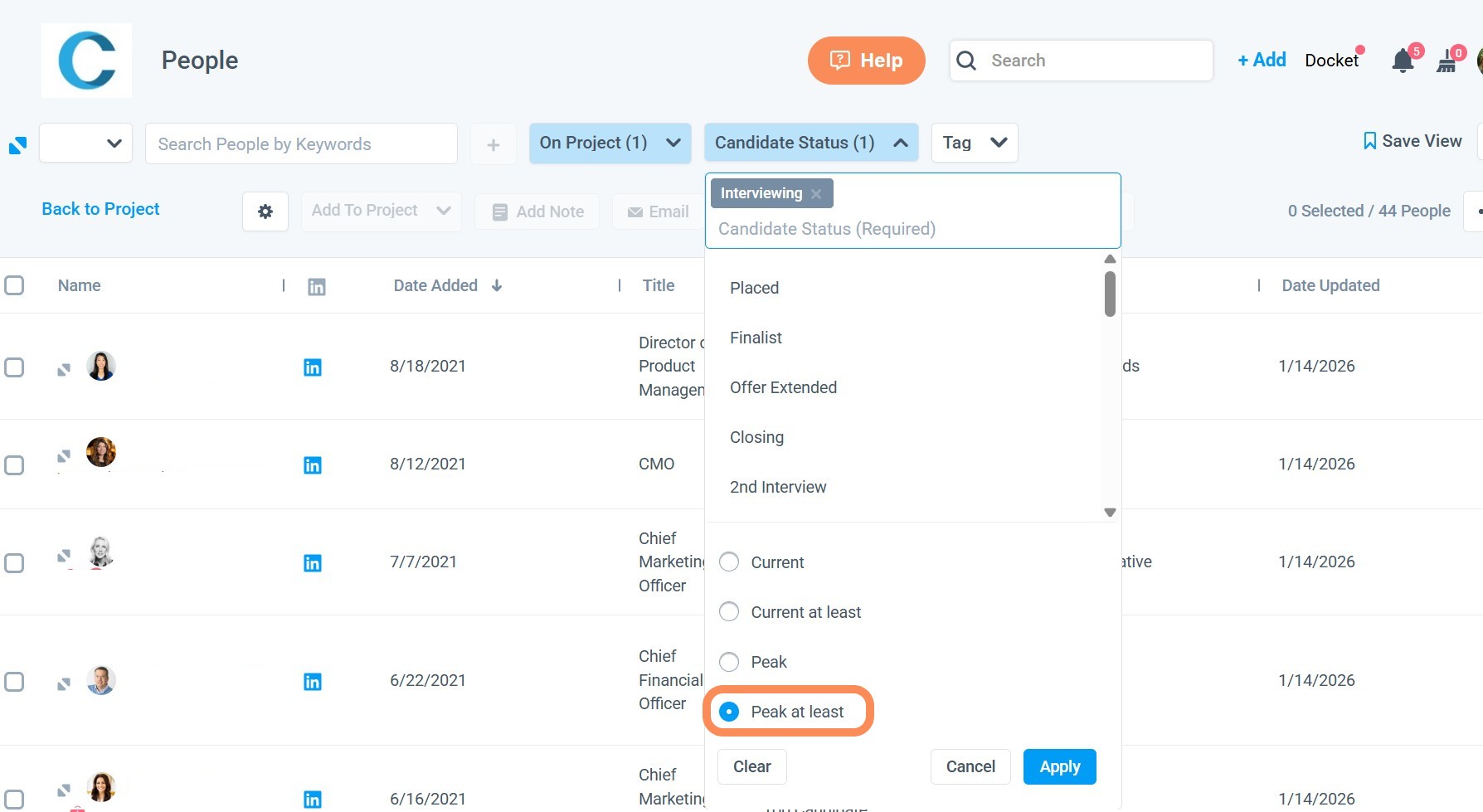 The Candidate status filter default will sort by "Peak at least".