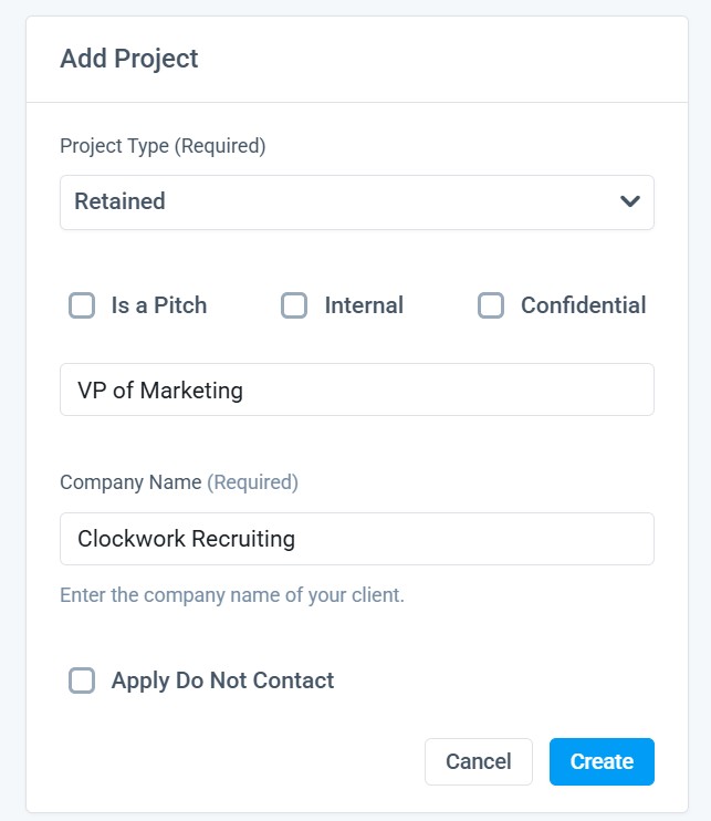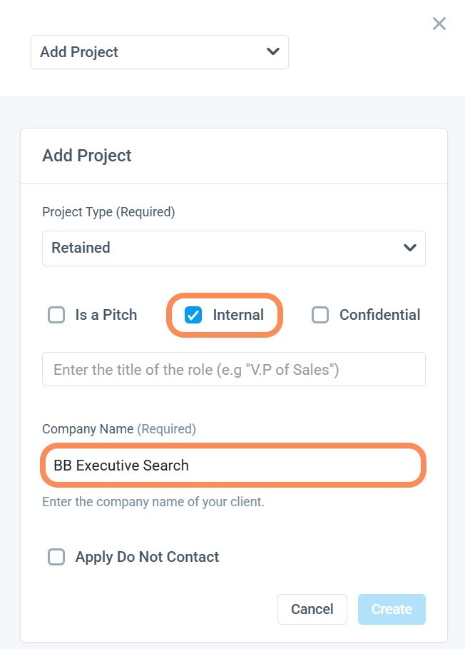 Marking a project as Internal will automatically populate your Firm's Name. Adding the Title and project Type will highlight the Create Button.