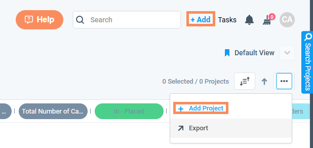 Create a project anywhere in the application by clicking the "+Add" button in the upper-right corner OR from your Project View.