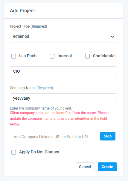 If the company is not already listed in your company database or misspelled, you will receive the below message upon clicking on the create button. Enter the company's LinkedIn or Website URL to create the project and enrich the company profile at the same time.