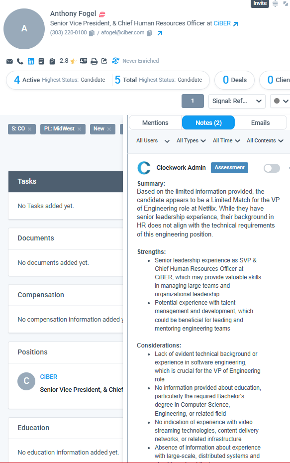 CAI (Clockwork AI) searches through the person record: Resume, Bio, Work History, Contact Details, Notes (limited to 2 years of notes) and email tab (365 integration or Google integration with Clockwork) to produce the results.